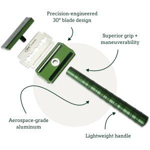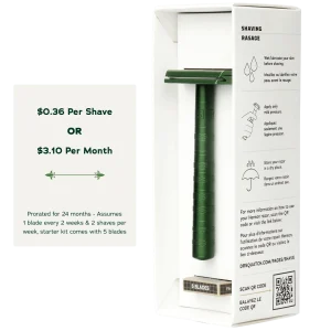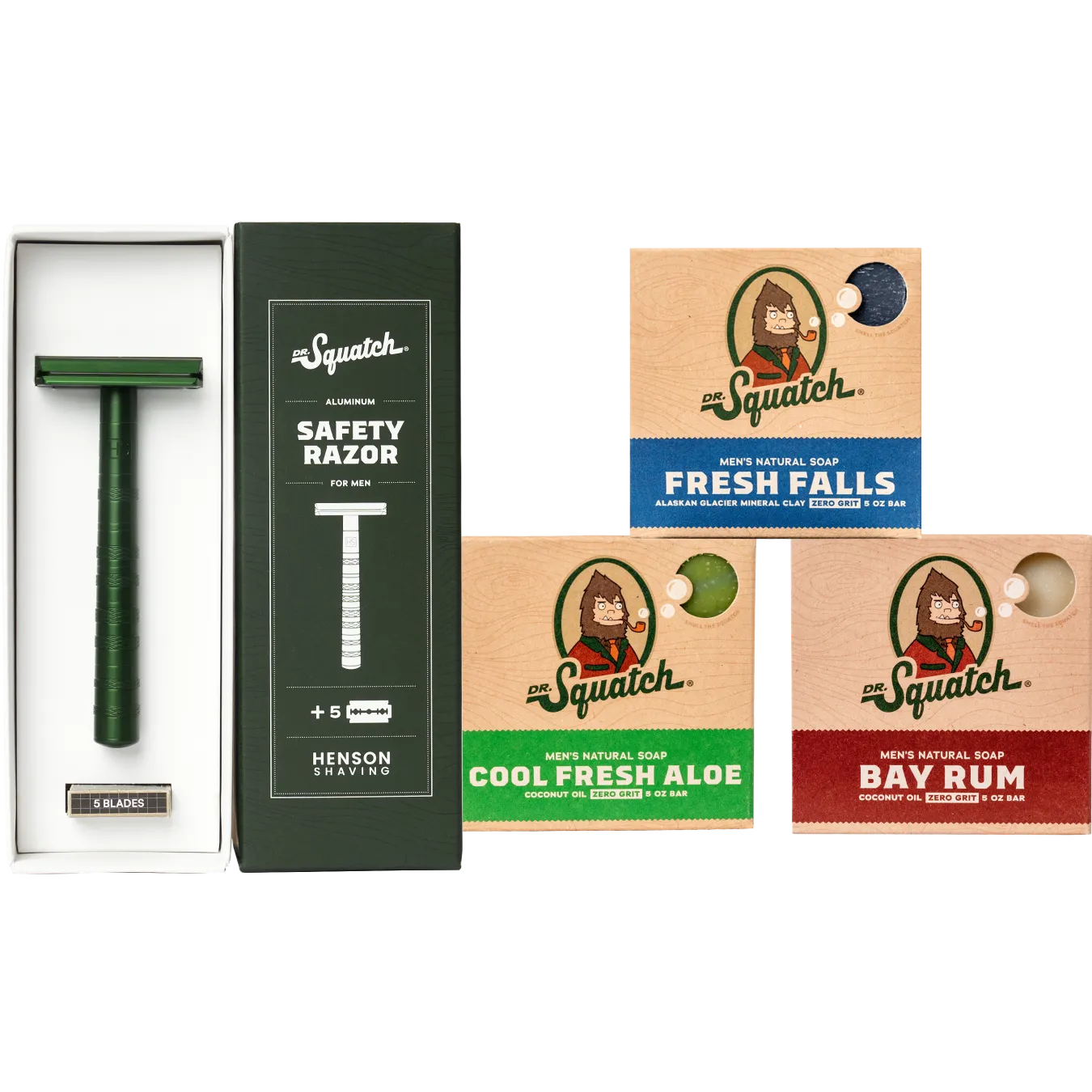 Kit includes: Safety Razor + 5 Blades, Fresh Falls, Cool Fresh Aloe, Bay Rum Bar Soaps